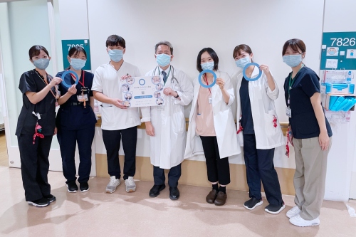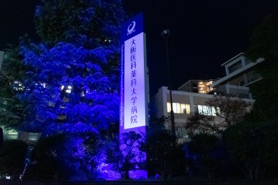 病院正面玄関の看板を世界糖尿病デーのシンボルカラーのブルーにライトアップします。