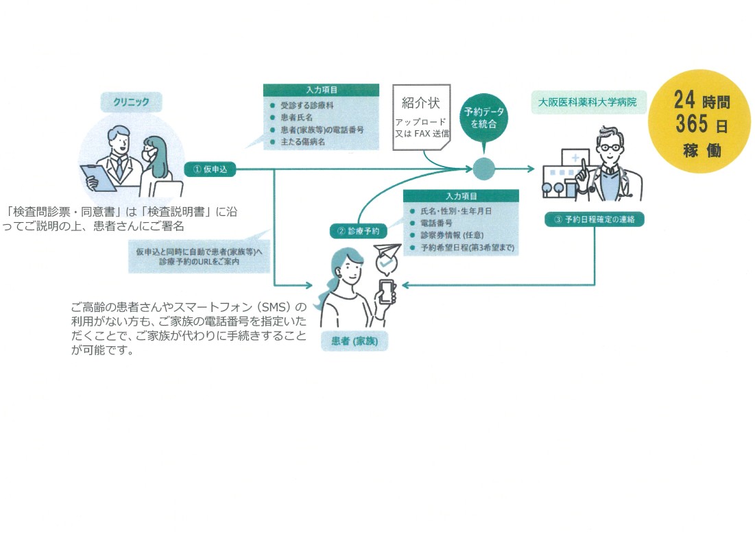 紹介元のクリニック様は基本情報を入力して、患者さんに紹介状をお渡しいただき、紹介状は申込日当日中にFAX送信いただくだけで、紹介手続きは完了します。日程調整は患者さんと 当院とで行います。