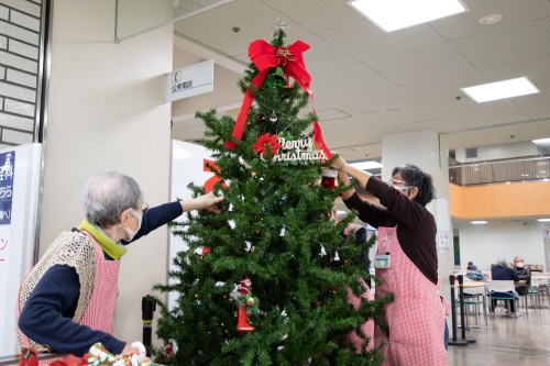 病院ボランティアグループ「ふれあい」の皆さんが、サンタクロースや長靴、金銀のオーナメントボールやベルなどを飾りつけてくださいました。