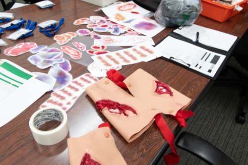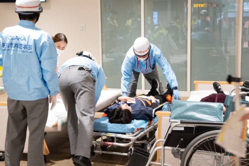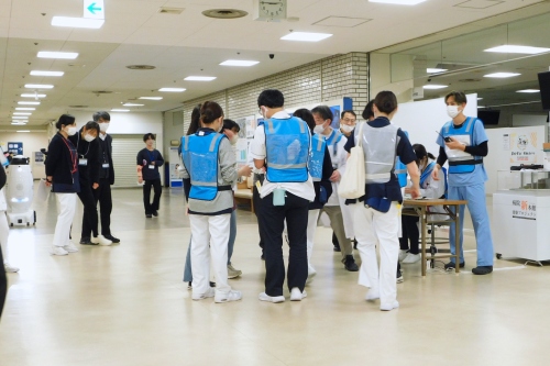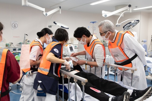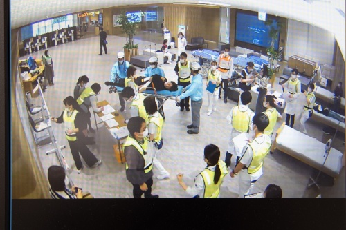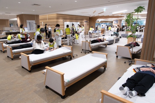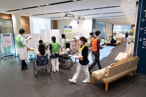 訓練では大規模震災を想定し、当院の災害対策マニュアル及びBCPに従った応急診療エリアのレイアウト構築、多数傷病者の受け入れ、関連部署との通信連絡、災害診療記録への記載等への訓練を、模擬患者を使って実施しました。模擬患者には本学のライフサポートクラブが参加しました。